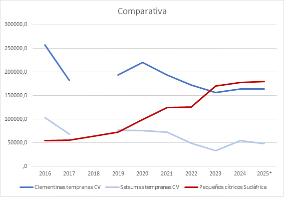 | Año | Clementinas tempranas C. Valenciana | Satsumas tempranas C. Valenciana | Mandarinas Sudáfrica |