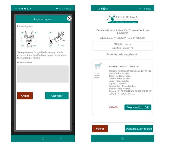 - Precinto digital con la aplicación CapturCyL. Antes de salir a cazar, con conexión a Internet, deben abrir la aplicación y pinchar en ‘Firmo/Acepto’. Así la autorización se activa por el tiempo pactado. Para usar la aplicación no se requiere ni de correo electrónico ni de certificado digital. En dos sencillos pasos precintarán digitalmente la pieza abatida y se generará automáticamente un código QR, que es el justificante de la legalidad de la captura. Por la legislación de protección de datos, CapturCyL no geolocaliza al cazador, solo marca el lugar cuando se abate la pieza y se usa el precinto digital. El cazador no debe preocuparse por falta de cobertura, ya que la aplicación no la necesita al registrar la captura (los datos se envian al sistema cuando el dispositivo nuevamente tiene cobertura). En este enlace aparece el manual de uso de la aplicación, que puede instalarse tanto en los móviles Android (Google Play) como para iOS (Apple)