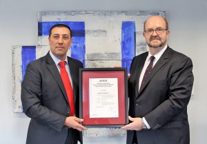El Director Gerente de Jamones Airesano, Javier Gómez ha recibido el certificado del Director de Desarrollo de Negocio de AENOR, Manuel Romero.