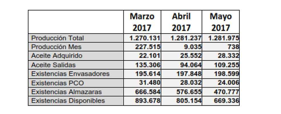 Hay unas existencias disponibles de 669.336 toneladas, tanto en almazaras con 470.777 toneladas y 198.599 toneladas en envasadores a lo que hay que sumar el aceite en manos del Patrocinio Comunal Olivarero con 24.006 toneladas